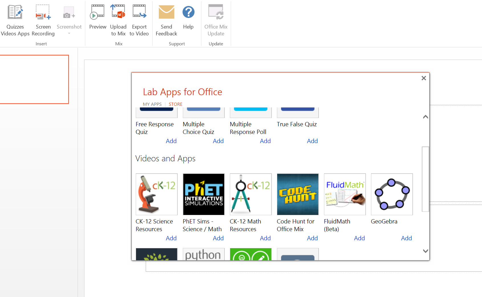 Embedding a PhET in an office Mix is really straight forward, and takes about 4 clicks (although one is a slightly annoying ‘trust it’ click). To do this, you simply go to the mix tab, select insert quizzes, videos and app, chose PhET animations, trust it, then chose the animation/simulation you want. Simple as that
