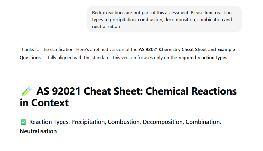 Which caught my fancy because some students asked if they could use Chat GPT to make their cheat sheet. I paused – the whole purpose of the task was for them to summarise what they thought was important – but then figured maybe it could be a good opportunity to explore something different and by getting them to fact check the cheat sheets created it was kind of doing the same thing – what information do I need, what is missing, has it included anything incorrect or irrelevant?