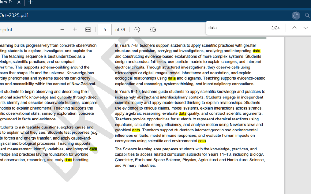 And I had more success – but even then… for example, data comes up 24 times in the doc, but 8 are into the intro and purpose statement. 4 are in the practices for yr 0-6 – so for 6 years there is only 4 mentions of data. Then not at all in yr 7-8. Which leaves 10 mentions in yr 9-10. Now, I do understand this is a blunt tool, but the introduction explicitly states yr 7-8 will be analysing and interpreting data, but then it isn’t in the ‘skills, strategies and applications to teach’ for phase 3/yr 7&8