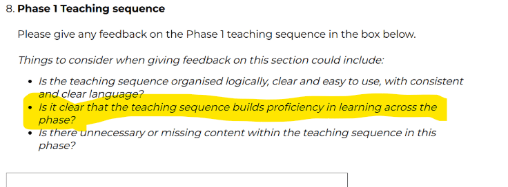 So, my initial answer to the feedback question is no – I can’t see how the teaching sequence builds proficiency across a phase, because either the content switches so there is no progression across the phase, or the ‘topics’ switch around so I am struggling to see the progression of ideas. One of the stated aims of the curriculum doc was to make it clear what needed to be taught – I can identify soooo many things that would need to be taught to be able to do some of the things in the statement, that are not mentioned anywhere in the doc.
