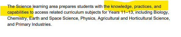 So, I’m not sure how teachers are meant to support teachers to develop these capabilities if they are not stated in the ‘this is what you need to teach’. No solving problems. (solv is only in dissolving/dissolve). No creativity – mentioned once in the purpose statement.