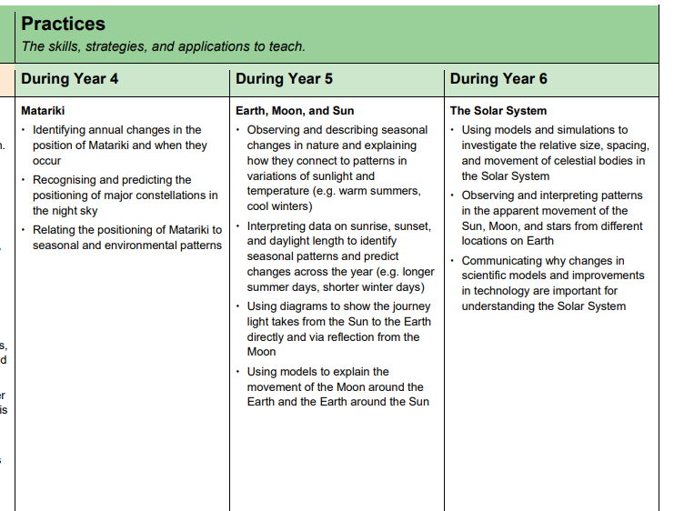 We have identifying, recognising and relating in yr 4. Predicting the positioning is quite a challenge for yr 4 I thought, but maybe I underestimate them…. Then yr 5 is observing and describing and explaining (This feels very much like some doing verbs in front of facts rather than actually how we work these things out), interpreting data (yay, data) to identify patterns (quite like this so far). Then using diagrams to show the journey of light from the Sun to the Earth…. is that just drawing an arrow? At yr 6 – using models – so, is this the teacher teaching this (says me who get a kid to hold a torch, and then gets some kids moving balls about the room to be planets… and I have an excellent lego scale model with working gears….) or……???? Then we have some investigating using models. I like this one, have a play and try and get your heads around the vastness of the distances. But then we have observing and interpreting patterns in the ‘apparent’ movement of the Sun, Moon and stars from different locations on Earth – well sign me up for that field trip!! Because how can we do this? Just with pictures? Given the number of times I’ve seen northern hemisphere phases of the moon passed of as what we see in Aotearoa NZ, I’m not so confident on this one.
