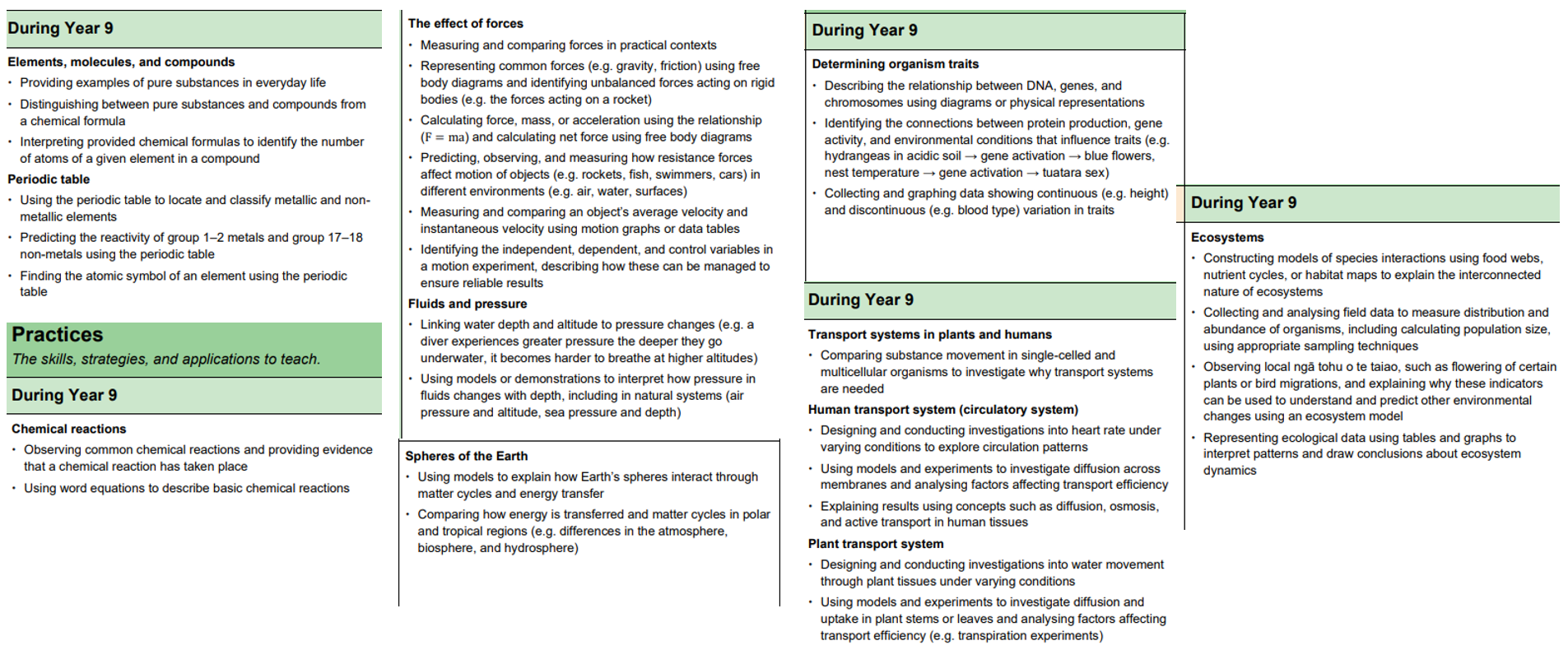 So, lets check a teaching sequence for some practices (AND in doing so, I noticed that the ‘elements’ change – materials from 0-8 becomes matter at 9-10. Matter, interactions and energy becomes chemical reactions…. why??