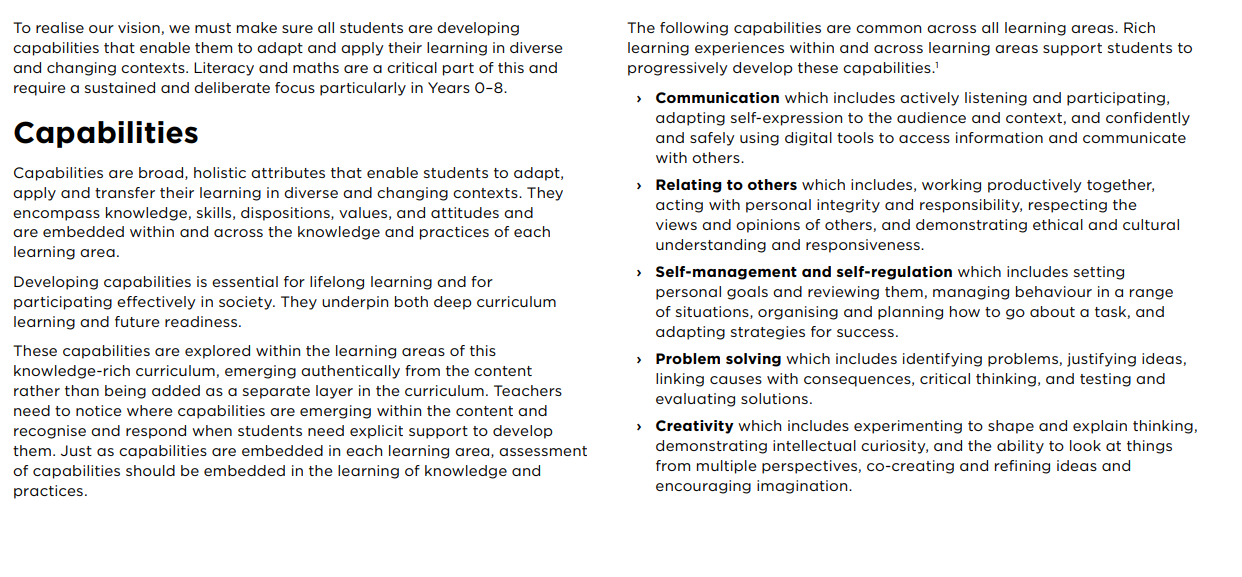 The intro and the Te Mātaiaho document says we are developing capabilities – lets go look for them